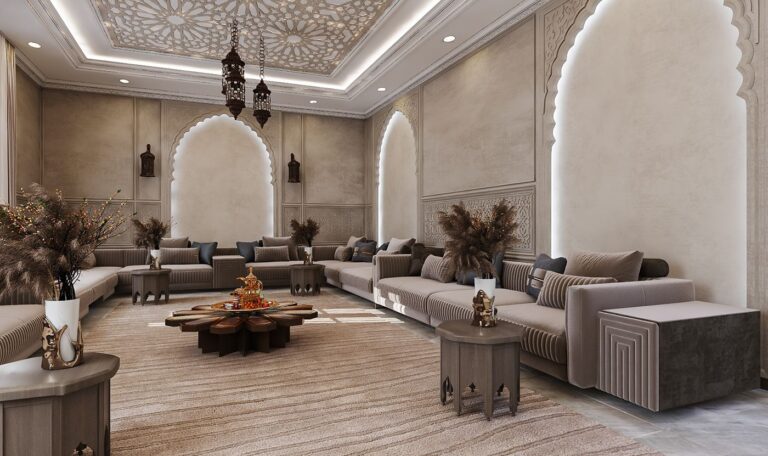 Rich fabrics, carved wood furniture, and ornate lighting fixtures complete the look. Many families choose this style to honor Emirati heritage. The design balances tradition with modern amenities like air conditioning and smart technology.
