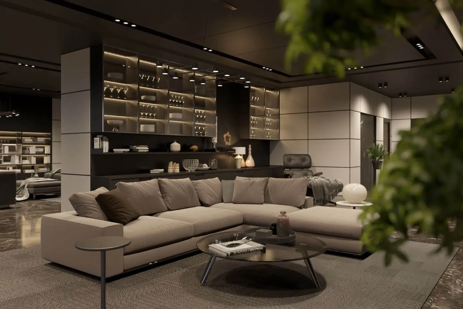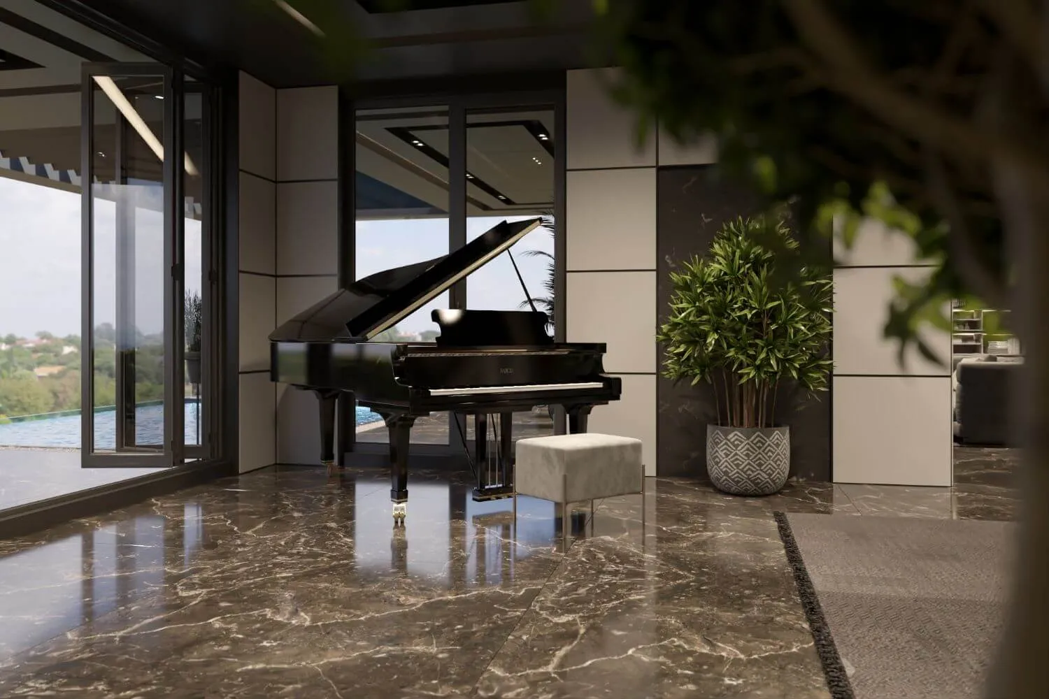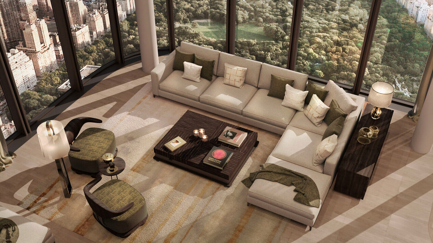 Luxurious penthouse furnishings with marble decoration, branded lighting, exquisite furniture, and signature statement features
